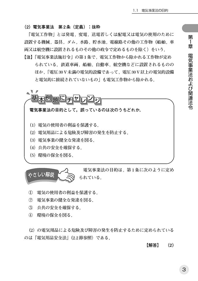 法規は、電気事業法や電気工事士法、電気設備技術基準などの法令については条文自体が出題される、3種では出題されない施設管理の問題が出題される、という傾向があります。