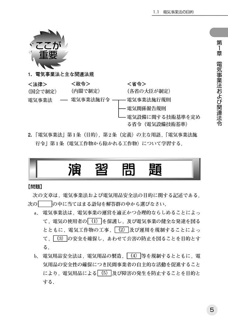 法規は、電気事業法や電気工事士法、電気設備技術基準などの法令については条文自体が出題される、3種では出題されない施設管理の問題が出題される、という傾向があります。